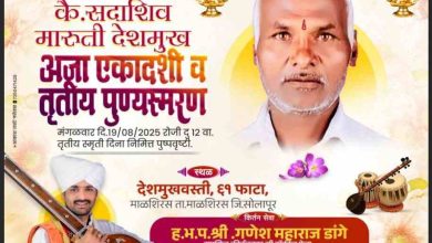 कै. सदाशिव मारुती देशमुख पुण्यतिथी व अजा एकादशीनिमित्त किर्तन सेवा अकलूज वैभव न्यूज नेटवर्क आकाश भाग्यवंत नायकुडे. मुंबई दिनांक 18/8/2025…