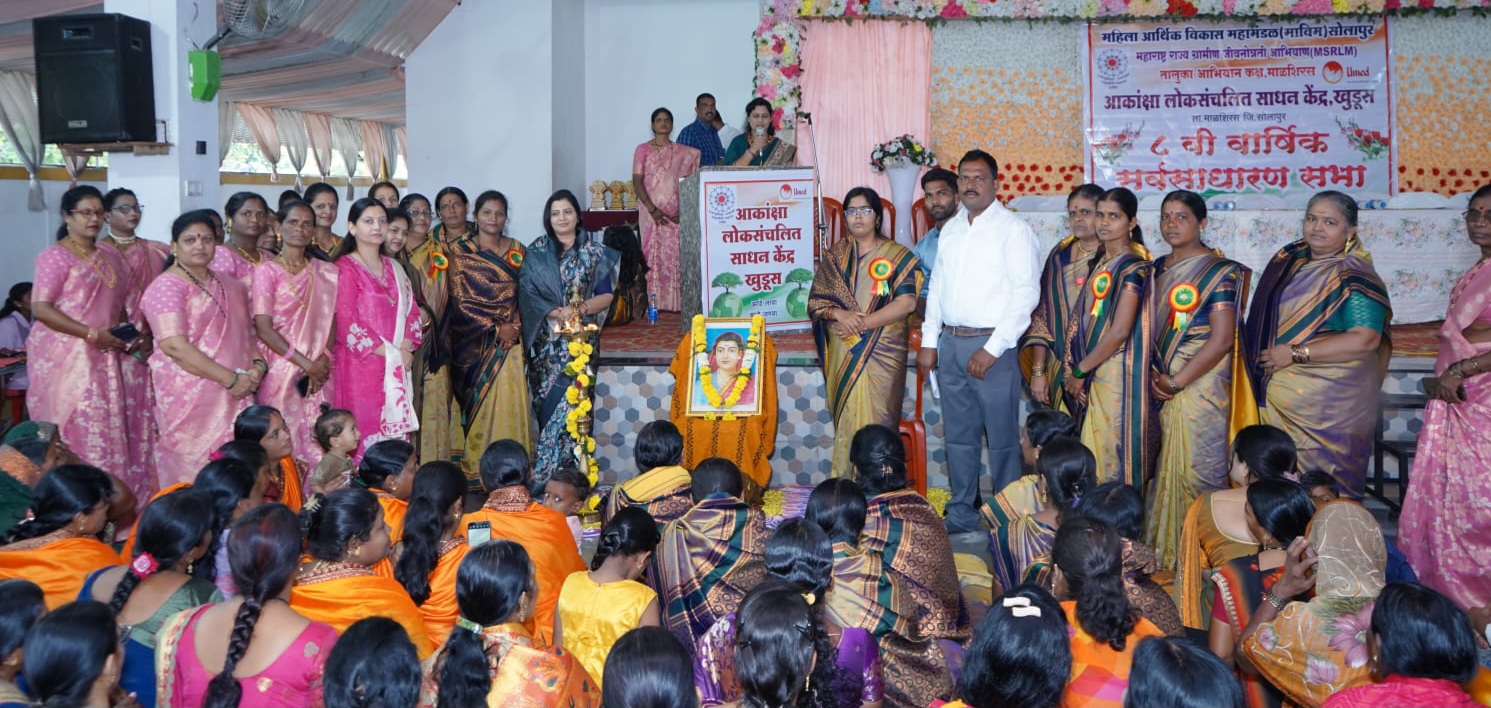 महिला आर्थिक विकास महामंडळ जिल्हा कार्यालय सोलापूर महाराष्ट्र राज्य ग्रामीण जीवनोन्नती अभियान अंतर्गत तालुका अभियान कक्ष माळशिरस अंतर्गत आकांक्षा लोकसंचलित साधन केंद्र खडूस या संस्थेची ८ वी वार्षिक सर्वसाधारण सभा पाटीदार भवन मंगल कार्यालय अकलूज येथे बचत गटातील सभासदांच्या उपस्थितीत संपन्न झाली.