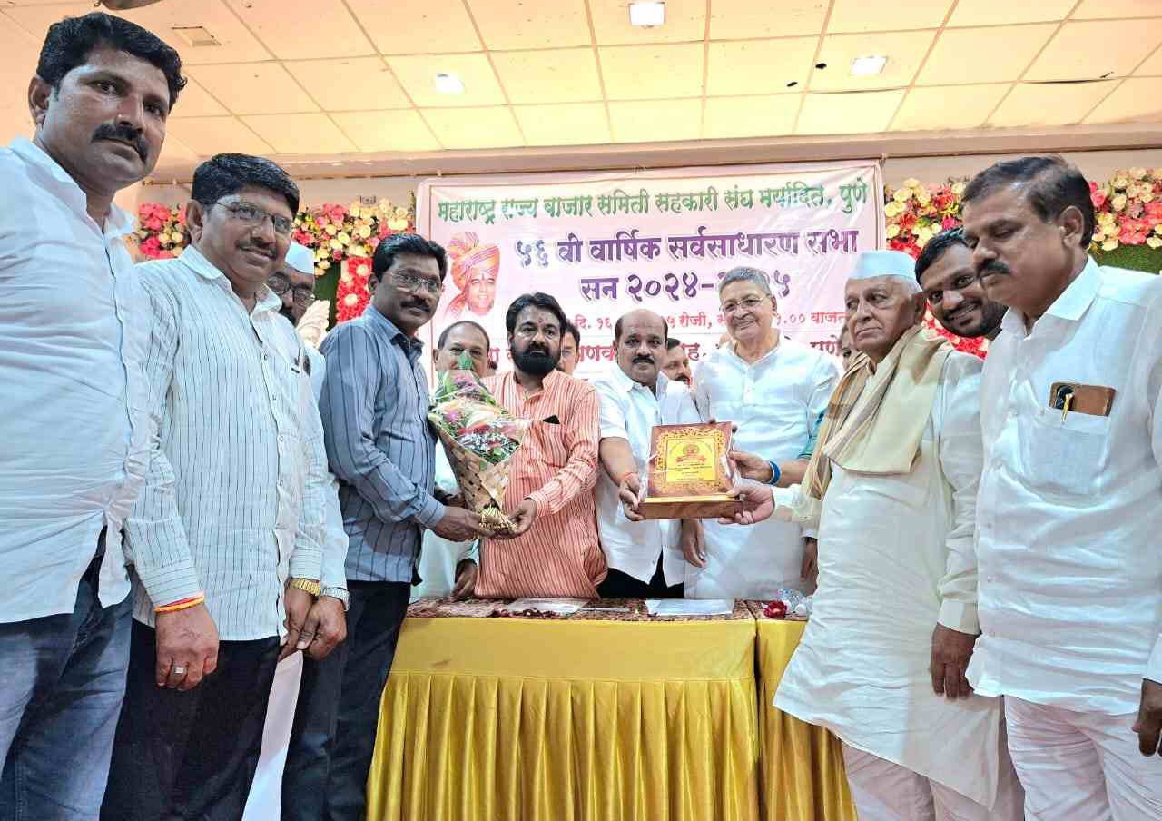 मुंबई दिनांक 18/09/2025 : महाराष्ट्र राज्य बाजार समिती सहकारी संघ मर्या. पुणे यांच्या वतीने देण्यात येणाऱ्या “वसंतदादा पाटील स्मृती पुरस्काराने” अकलूज कृषी उत्पन्न बाजार समितीस सन्मानित करण्यात आले आहे. महाराष्ट्रामध्ये उत्कृष्ट कार्य करणाऱ्या बाजार समितीस सदरचा पुरस्कार देण्यात येतो. सदरचा पुरस्कार महाराष्ट्र राज्य बाजार समिती सहकारी संघाचे सभापती प्रविणकुमार नाहाटा यांच्या शुभ हस्ते बाजार समितीचे सभापती मदनसिंह मोहिते पाटील, संचालक बाबुराव कदम, बाळासाहेब माने देशमुख, मारूतराव रुपनवर, शिवाजी चव्हाण, नितीन सावंत व बाजार समितीचे सचिव राजेंद्र काकडे यांनी स्वीकारला.