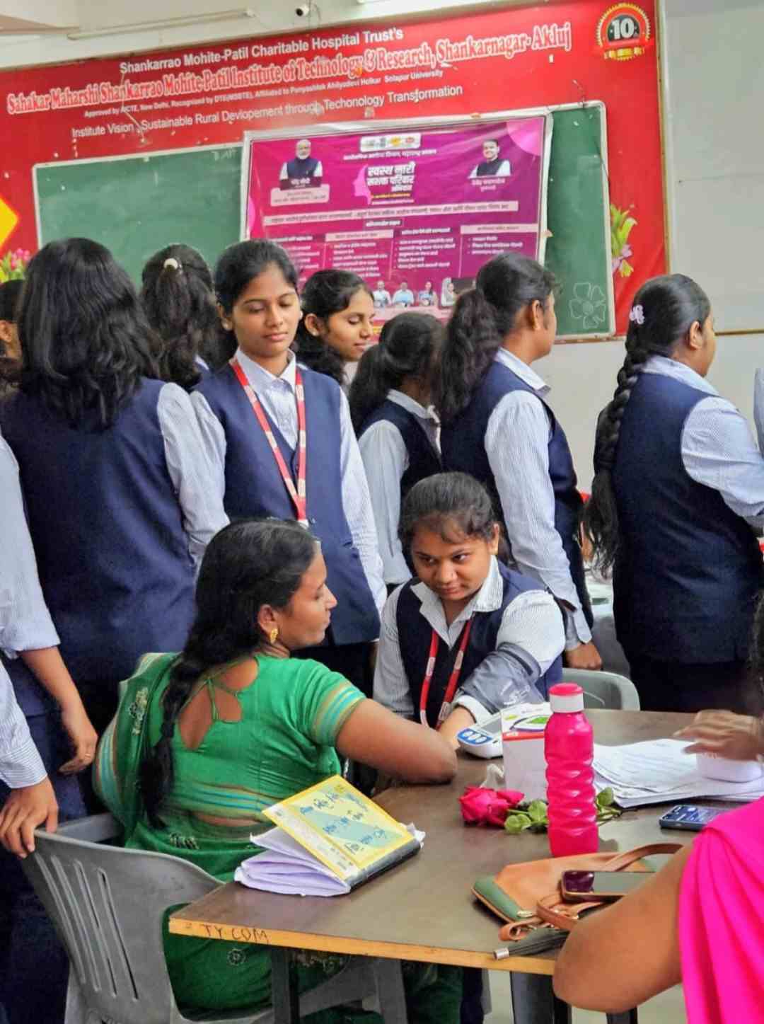 अकलूज येथील सहकार महर्षी शंकरराव मोहिते पाटील इन्स्टिट्यूट ऑफ टेक्नॉलॉजी अँड रिसर्च, शंकरनगर, अकलूज येथे महिला तक्रार व निवारण समिती व प्राथमिक आरोग्य केंद्र, शंकरनगर यांचे संयुक्त विद्यमाने” स्वस्थ नारी – सशक्त परिवार” या अभियाना अंतर्गत महिला व विद्यार्थिनींसाठी विशेष आरोग्य तपासणी शिबिराचे आयोजन महाविद्यालय विकास समिती अध्यक्षा स्वरूपाराणी जयसिंह मोहिते पाटील यांच्या मार्गदर्शनाखाली दुर्गाफेस्ट २०२५ निमित्त करण्यात आल्याची माहिती महाविद्यालयाचे प्राचार्य डॉ. प्रवीण ढवळे यांनी दिली.