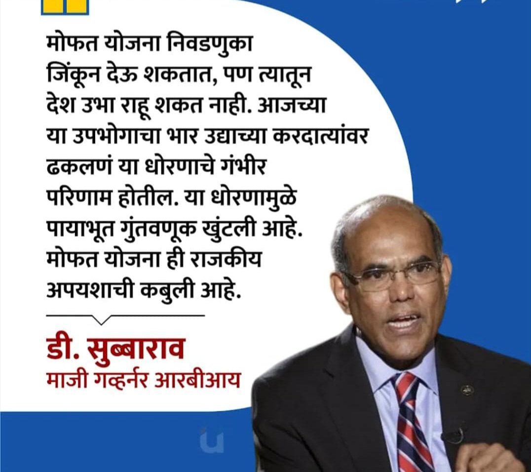 मुंबई दिनांक 01/12/2025 : भारतात गेल्या काही निडवणुकांमध्ये अनेक योजनेअंतर्गत लोकांना मोफत पैसे देण्याचं चलन सुरू झालं आहे. मध्य प्रदेशातील लाडली बहन, महाराष्ट्रातील लाडकी बहीण अन् नुकत्याच झालेल्या बिहार निडवणुकीत महिलांच्या खात्यात १० हजार रूपये ट्रन्सफर करणे या सारख्या योजनांचा समावेश आहे. याच मोफत पैसे देण्याच्या योजनेवरून आरबीआयचे माजी गव्हर्नर डी सुब्बाराव यांनी एक मोठा इशारा दिला आहे.