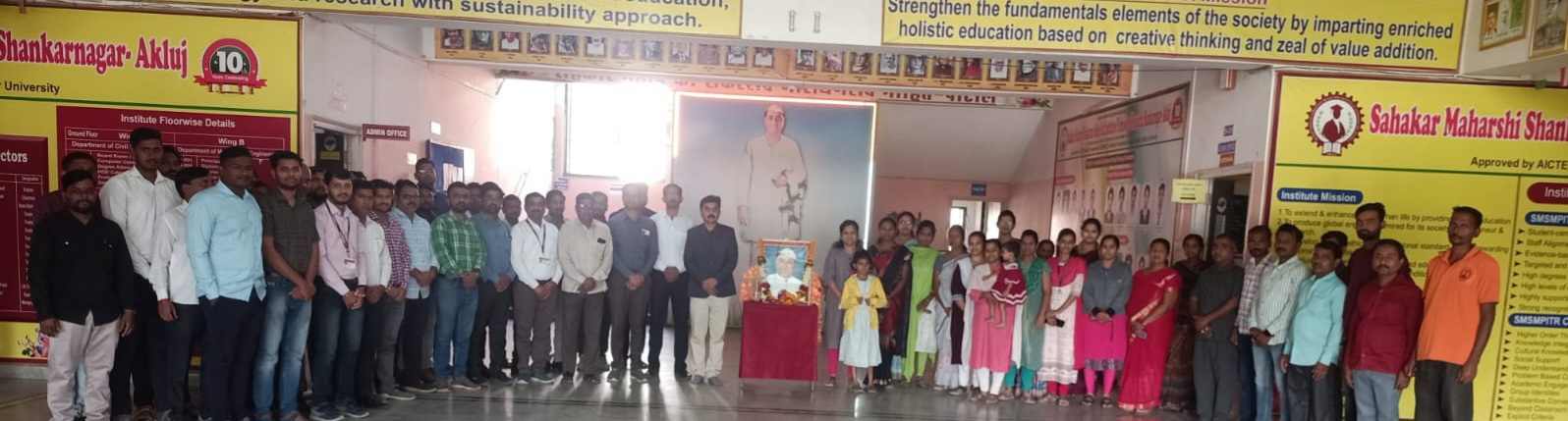 येथील सहकार महर्षि शंकरराव मोहिते-पाटील इन्स्टिट्यूट ऑफ टेक्नॉलॉजी अँड रिसर्च, शंकरनगर,अकलूज या अभियांत्रिकी महाविद्यालयामध्ये दि. ११/२/२०२४ रोजी कै. सहकार महर्षि शंकरराव मोहिते-पाटील यांची पुण्यतिथी साजरी करण्यात आली. महाविद्यालयाचे प्राचार्य डॉ.प्रविण ढवळे यांच्या हस्ते काकासाहेबांच्या प्रतिमेचे पूजन करण्यात आले. त्यानंतर इलेक्ट्रॉनिक्स अँड टेलिकम्युनिकेशन विभागामधील प्राध्यापिका प्रीती सोमवंशी यांनी काकासाहेब यांच्या जीवनकार्याचा थोडक्यात परिचय दिला.