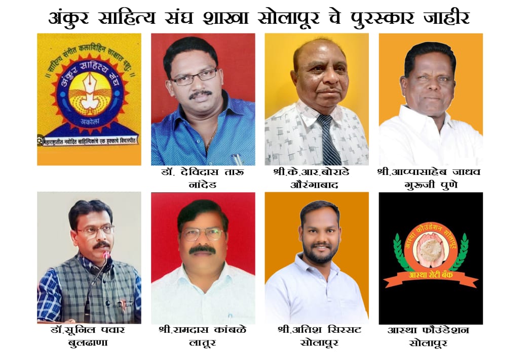 नवोदित साहित्यिकांचे हक्काचे विचारपीठ असलेल्या अंकुर साहित्य संघ सोलापूरच्या वतीने देण्यात येणाऱ्या राज्यस्तरीय साहित्य व राज्यस्तरीय समाज भूषण पुरस्कार घोषणा करण्यात आली असल्याची माहिती अंकुर साहित्य संघाचे केंद्रीय उपाध्यक्ष तथा पत्रकार भरतकुमार मोरे जिल्हाध्यक्ष कवी नागनाथ गायकवाड यांनी पत्रकार परिषदेमध्ये दिली.