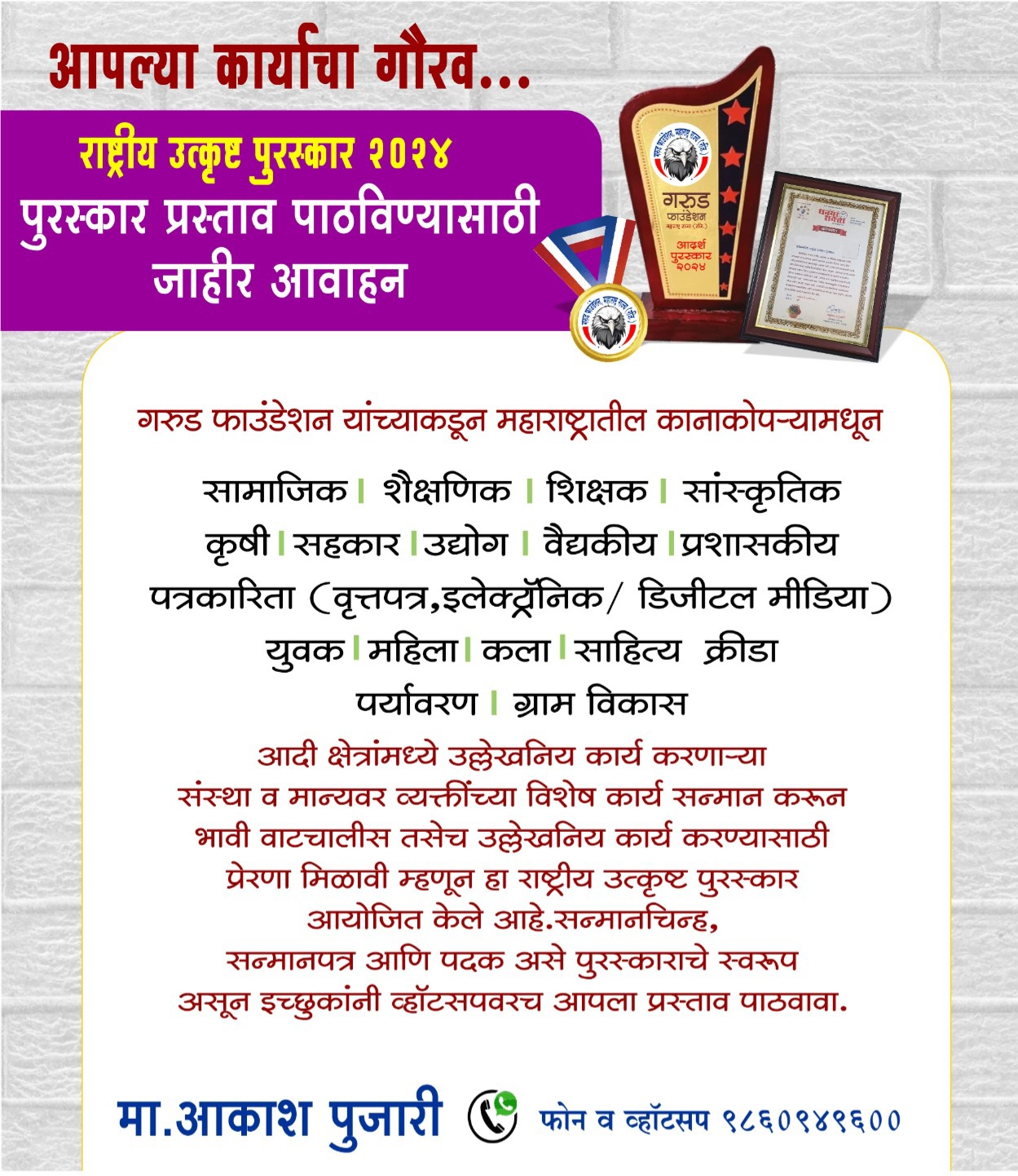 “सामाजिक, शैक्षणिक, सांस्कृतिक, कृषी, सहकार, उद्योग, वैद्यकीय, प्रशासकीय, पत्रकारिता (वृत्तपत्र, इलेक्ट्रॉनिक/ डिजीटल मीडिया), युवक, महिला, कला, साहित्य, क्रीडा, पर्यावरण, ग्राम विकास आदी क्षेत्रांमध्ये उल्लेखनिय कार्य करणाऱ्या संस्था व व्यक्तींना प्रेरणा, प्रोत्साहन देण्याचे हेतूने गरुड फाउंडेशन द्वारे राष्ट्रीय उत्कृष्ट पुरस्कार देण्यात येणार आहे अशी माहिती फाउंडेशनचे संस्थापक अध्यक्ष आकाश पुजारी यांनी साप्ताहिक अकलूज वैभव, पाक्षिक वृत्त एकसत्ता आणि aklujvaibhav.in ला सांगितली.