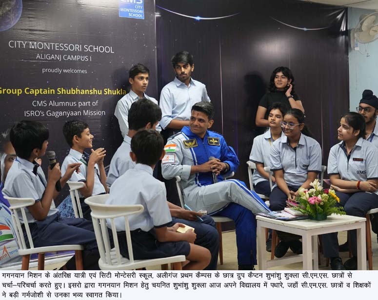 рд▓рдЦрдирдК, 30 рдордИред рд╕рд┐рдЯреА рдореЛрдиреНрдЯреЗрд╕рд░реА рд╕реНрдХреВрд▓, рдЕрд▓реАрдЧрдВрдЬ рдкреНрд░рдердо рдХреИрдореНрдкрд╕ рдХреЗ рдЫрд╛рддреНрд░ рдПрд╡рдВ рдЧрдЧрдирдпрд╛рди рдорд┐рд╢рди рдХреЗ рдЕрдВрддрд░рд┐рдХреНрд╖ рдпрд╛рддреНрд░реА рдЧреНрд░реБрдк рдХреИрдкреНрдЯрди рд╢реБрднрд╛рдВрд╢реБ рд╢реБрдХреНрд▓рд╛ рдЖрдЬ рдПрдХ рдмрд╛рд░ рдлрд┐рд░ рд╕реЗ рдЕрдкрдиреЗ рдЙрд╕ рд╡рд┐рджреНрдпрд╛рд▓рдп рдкрд░рд┐рд╕рд░ рдореЗрдВ рдкрдзрд╛рд░реЗ рдЬрд╣рд╛рдБ рдПрдХ рдЫрд╛рддреНрд░ рдХреЗ рд░реВрдк рдореЗрдВ рдЙрдиреНрд╣реЛрдВрдиреЗ рдЕрдкрдиреЗ рднрд╛рд╡реА рдЬреАрд╡рди рдХреЗ рд╕рдкрдиреЛрдВ рдХреЛ рд╕рдВрдЬреЛрдпрд╛ рдФрд░ рдЕрдкрдиреЗ рд╢рд┐рдХреНрд╖рдХреЛрдВ рдХреЗ рдорд╛рд░реНрдЧрджрд░реНрд╢рди рдореЗрдВ рдореЗрд╣рдирдд, рд▓рдЧрди рд╡ рд╕рдВрдХрд▓реНрдкрд╢рдХреНрддрд┐ рд╕реЗ рдЕрдкрдиреЗ рд╕рдкрдиреЛрдВ рдХреЛ рд╕рд╛рдХрд╛рд░ рднреА рдХрд┐рдпрд╛ред рд╢реБрднрд╛рдВрд╢реБ рд╢реБрдХреНрд▓рд╛ рдЙрди рдЪрд╛рд░ рдЕрдВрддрд░рд┐рдХреНрд╖ рдпрд╛рддреНрд░рд┐рдпреЛрдВ рдореЗрдВ рд╕реЗ рдПрдХ рд╣реИрдВ рдЬрд┐рдиреНрд╣реЗрдВ рдЧрдЧрдирдпрд╛рди рдорд┐рд╢рди рд╣реЗрддреБ рдЗрд╕рд░реЛ рдиреЗ рдЪрдпрдирд┐рдд рдХрд┐рдпрд╛ рд╣реИред рд╕реА.рдПрдо.рдПрд╕. рдкреНрд░рдмрдиреНрдзрдХ рдкреНрд░реЛ. рдЧреАрддрд╛ рдЧрд╛рдБрдзреА рдХрд┐рдВрдЧрдбрди рдХреЗ рдорд╛рд░реНрдЧрджрд░реНрд╢рди рдореЗрдВ рд╕реА.рдПрдо.рдПрд╕. рдЫрд╛рддреНрд░реЛрдВ рд╡ рд╢рд┐рдХреНрд╖рдХреЛрдВ рдиреЗ рдмреЬреЗ рд╕реНрдиреЗрд╣ рд╡ рдЧрд░реНрд╡ рд╕реЗ рд╕реА.рдПрдо.рдПрд╕. рдЕрд▓реАрдЧрдВрдЬ рдкреНрд░рдердо рдХреИрдореНрдкрд╕ рдореЗрдВ рд╢реБрднрд╛рдВрд╢реБ рдХрд╛ рд╣рд╛рд░реНрджрд┐рдХ рд╕реНрд╡рд╛рдЧрдд рдХрд┐рдпрд╛, рдЬрд┐рдиреНрд╣реЛрдВрдиреЗ рдЕрдкрдиреА рдЕрддреБрд▓рдиреАрдп рдЙрдкрд▓рдмреНрдзрд┐ рд╕реЗ рди рд╕рд┐рд░реНрдл рд╕реА.рдПрдо.рдПрд╕. рдХрд╛ рдЕрдкрд┐рддреБ рд▓рдЦрдирдК рд╡ рдкреВрд░реЗ рдкреНрд░рджреЗрд╢ рдХрд╛ рдирд╛рдо рдЧреМрд░рд╡рд╛рдиреНрд╡рд┐рдд рдХрд┐рдпрд╛ рд╣реИред рдЗрд╕ рдЕрд╡рд╕рд░ рдкрд░ рд╕реА.рдПрдо.рдПрд╕. рдЕрд▓реАрдЧрдВрдЬ рдкреНрд░рдердо рдХреИрдореНрдкрд╕ рдХреА рддрддреНрдХрд╛рд▓реАрди рдкреНрд░рдзрд╛рдирд╛рдЪрд╛рд░реНрдпрд╛ рд╢реНрд░реАрдорддреА рдЧреМрд░реА рдЦрдиреНрдирд╛ рдХреА рдЙрдкрд╕реНрдерд┐рддрд┐ рд╕рднреА рдХреЗ рд▓рд┐рдП рдкреНрд░реЗрд░рдгрд╛рд╕реНрд░реЛрдд рд░рд╣реАред рд╡рд┐рджреНрдпрд╛рд▓рдп рдХреА рд╡рд░рд┐рд╖реНрда рдкреНрд░рдзрд╛рдирд╛рдЪрд╛рд░реНрдпрд╛ рд╢реНрд░реАрдорддреА рдЬреНрдпреЛрддрд┐ рдХрд╢реНрдпрдк рд╡ рдкреНрд░рдзрд╛рдирд╛рдЪрд╛рд░реНрдпрд╛ рд╢реНрд░реАрдорддреА рд╢рд┐рд╡рд╛рдиреА рд╕рд┐рдВрд╣ рдиреЗ рднреА рд╢реБрднрд╛рдВрд╢реБ рдХрд╛ рд╣рд╛рд░реНрджрд┐рдХ рд╕реНрд╡рд╛рдЧрдд рдХрд░рддреЗ рд╣реБрдП рдЙрдирдХреЗ рдЙрдЬреНрдЬрд╡рд▓ рднрд╡рд┐рд╖реНрдп рдХреА рдХрд╛рдордирд╛ рдХреАред