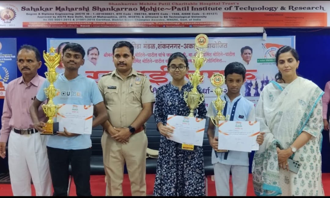 प्रताप क्रीडा मंडळ शंकरनगर अकलूज यांच्यावतीने श्रीमती रत्नप्रभादेवी मोहिते- पाटील यांच्या जन्मशताब्दीनिमित्ताने आणि जयसिंह मोहिते-पाटील व मदनसिंह मोहिते-पाटील यांच्या अमृतमहोत्सवी वाटचाली निमित्त स. म. शंकरराव मोहिते पाटील इन्स्टिटयूट ऑफ टेक्नॉलॉजी अँड रिसर्च शंकरनगर, अकलूज येथे आयोजित केलेल्या ‘रत्नाई चषक’ राज्यस्तरीय बुध्दिबळ स्पर्धेचा बक्षीस वितरण सोहळा संपन्न झाला. सहा. मोटार वाहन निरीक्षक डॉ.राजकुमार देशमुख व मंडळाच्या अध्यक्षा कु. स्वरूपाराणी मोहिते- पाटील यांच्या हस्ते विजेत्यांना बक्षीसे देण्यात आली. यावेळी उपाध्यक्ष पोपट भोसले-पाटील, प्राचार्य प्रवीण ढवळे, सचिव बिभीषण जाधव, स्पर्धा प्रमुख अभिजित बावळे व मंडळाचे सर्व संचालक,सदस्य उपस्थित होते.