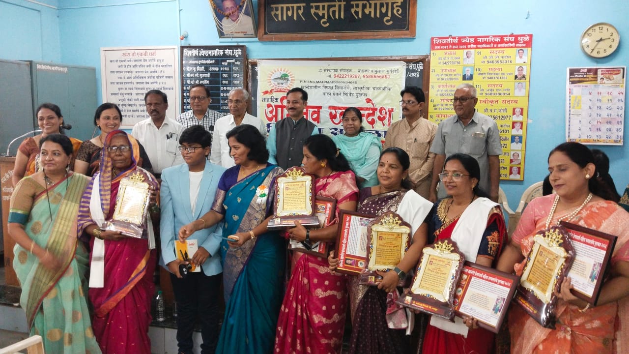 यावेळी साप्ताहिक अभिनव खान्देशकडून राज्यभरातील मोनिका शिंपी – धुळे, मनिषा गायकवाड- राहुरी, डॉ. पल्लवी परुळेकर बनसोडे-मुंबई, डॉ संगीता नांदुरकर धुळे, जया नेरे- नवापूर, प्रा. राजश्री चव्हाण- धुळे , डॉ शुभम राजेश पाटील- पालघर अशा एकूण नऊ कर्तृत्ववान महिलांना दिल्या जाणाऱ्या पुरस्कारात अंजनाबाई शहादू वाघ यांना राज्यस्तरीय जीवन गौरव पुरस्काराने सन्मानित केले.