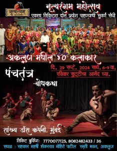 सहकार महर्षि शंकरराव मोहिते पाटील स्मृती भवन शंकरनगर अकलूज येथे रविवार दिनांक 29 सप्टेंबर 2024 रोजी सायंकाळी सहा ते नऊ या वेळेत सलग दोन सत्रांमध्ये कार्यक्रम सादर होणार आहे. पहिल्या सत्रामध्ये (पूर्वार्धात) नृत्यरंगम कला मंदिर चे विद्यार्थी पारंपरिक भरतनाट्यम नृत्याचे सादरीकरण करतील. दुसऱ्या सत्रामध्ये (उत्तरार्धात) मुंबई येथील सांख्य डान्स कंपनीचे कलाकार पंचतंत्र बोधकथा या नृत्य नाटिकेद्वारे भरतनाट्यम नृत्याविष्कार सादरीकरण करणार आहे.