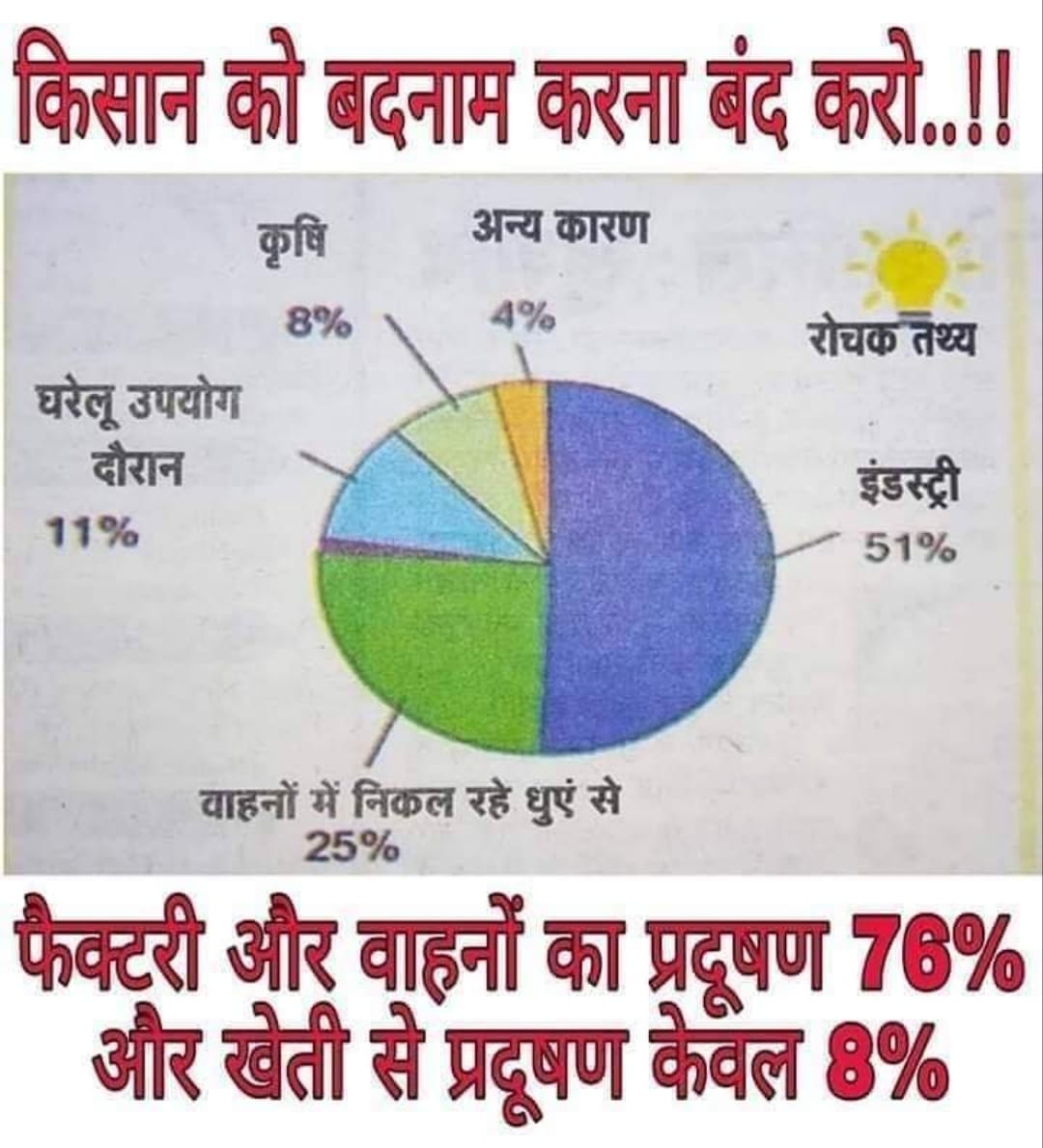 शेतकरी दिड वर्षातून एकदाच पाचट जाळतात, तेही एकाच वेळी नाही. तिकडे एकट्या दिल्लीमध्ये दररोज 1.2 कोटी वाहने (Delhi Statistical Handbook 2023) रस्त्यावर काळा धूर ओकत असतात. शिवाय दसरा, दिवाळी, होळी मधील फटाकेबाजीच्या धुराने आकाश काळवंडून जाते. औद्योगिक प्रदूषण करणाऱ्यांवर कारवाई केली जात नाही.