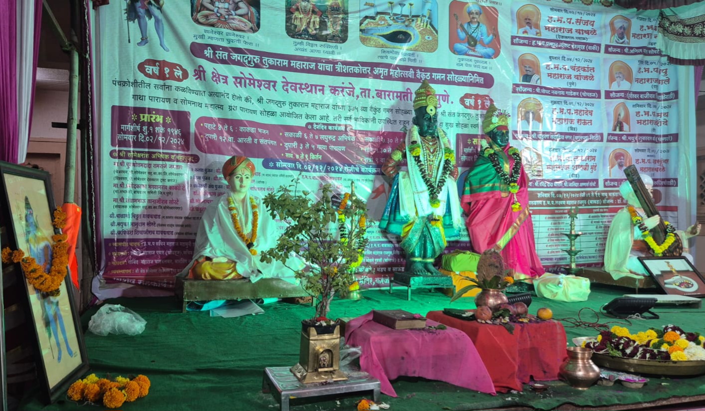 श्री संत जगद्गुरु तुकाराम महाराज यांच्या 375 व्या (त्री शतकोत्तर अमृत महोत्सव) वैकुंठ गमन सोहळ्यानिमित्त श्री संत जगद्गुरु तुकाराम महाराज संगीत गाथा पारायण व श्री सोमनाथ महात्म्य ग्रंथ पारायण सोहळा अखंड हरिनाम सप्ताह सोहळ्याचे श्री क्षेत्र सोमेश्वर देवस्थान करंजे तालुका बारामती जिल्हा पुणे येथे आयोजन करण्यात आलेले आहे. सोमवार दिनांक 2 डिसेंबर 2024 ते सोमवार दिनांक 9 डिसेंबर 2024 या कालावधीत संपन्न होणाऱ्या धार्मिक कार्यक्रमातील किर्तन मालिकेतील सहावे पुष्प ह.भ.प.अमय महाराज शिंदे ( वीर) यांनी शनिवार दिनांक 7 डिसेंबर 2024 रोजी सायंकाळी गुंफले.