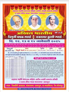 рд╕реНрдкрд░реНрдзреЗрдЪреЗ рд╣реЗ 46 рд╡реЗ рд╡рд░реНрд╖ рдЖрд╣реЗ. рд╕реНрдкрд░реНрдзреЗрдд рджрд┐рд▓реНрд▓реА, рд╣рд░рд┐рдпрд╛рдгрд╛, рдкрдВрдЬрд╛рдм, рдЙрддреНрддрд░ рдкреНрд░рджреЗрд╢, рдорд╣рд╛рд░рд╛рд╖реНрдЯреНрд░ рдпреЗрдереАрд▓ рд░рд╛рд╖реНрдЯреНрд░реАрдп рд╕реНрддрд░рд╛рд╡рд░реАрд▓ рдорд▓реНрд▓ рд╕рд╣рднрд╛рдЧреА рд╣реЛрддрд╛рдд. рддреНрд░рд┐рдореВрд░реНрддреА рдХреЗрд╕рд░реА рдХреБрд╕реНрддреА рд╕реНрдкрд░реНрдзреЗрд╕рд╛рдареА рдЦреБрд▓реНрдпрд╛ рдЧрдЯрд╛рдХрд░рд┐рддрд╛ рдкреНрд░рдердо рдХреНрд░рдорд╛рдВрдХрд╛рдЪреЗ рдмрдХреНрд╖рд┐рд╕ рддреНрд░рд┐рдореВрд░реНрддреА рдХреЗрд╕рд░реА рдЪрд╖рдХ рд╡ рджреЛрди рд▓рд╛рдЦ рд░реБрдкрдпреЗ, рджреНрд╡рд┐рддреАрдп рдХреНрд░рдорд╛рдВрдХрд╛рд╕рд╛рдареА рджрд┐рдб рд▓рд╛рдЦ рд░реБрдкрдпреЗ, рддреГрддрд┐рдп рдХреНрд░рдорд╛рдВрдХрд╛рд╕рд╛рдареА рдПрдХ рд▓рд╛рдЦ рд░реБрдкрдпреЗ рд╡ рдЪрддреБрд░реНрде рдХреНрд░рдорд╛рдВрдХрд╛рд╕рд╛рдареА рдкрдиреНрдирд╛рд╕ рд╣рдЬрд╛рд░ рд░реБрдкрдпрд╛рдВрдЪреА рд░реЛрдЦ рдмрдХреНрд╖рд┐рд╕реЗ рдареЗрд╡рдгреНрдпрд╛рдд рдЖрд▓реЗ рдЖрд╣реЗ. рддрд░ рд╡рдЬрдиреА рдЧрдЯрд╛рд╕рд╛рдареА реирел рддреЗ реорел рдХрд┐рд▓реЛ рдкрд░реНрдпрдВрдд рдПрдХреВрдг резрел рдЧрдЯрд╛рдиреБрд╕рд╛рд░ рд╡рд┐рдЬреЗрддреНрдпрд╛ рд╡ рдкрд░рд╛рдЬрд┐рдд рдорд▓реНрд▓рд╛рдВрдирд╛рд╣реА рднрд╡реНрдп рдмрдХреНрд╖реАрд╕ рджрд┐рд▓реА рдЬрд╛рддрд╛рдд. рдпрд╛рдЪреА рдкрд░рдВрдкрд░рд╛ рд╕рд░реНрд╡рдкреНрд░рдердо рдЖрдкрд▓реЗ рдпреЗрдереАрд▓ рдХреБрд╕реНрддреА рд╕реНрдкрд░реНрдзреЗрдкрд╛рд╕реВрди рдЖрдкрдг рд╕реБрд░реВ рдХреЗрд▓реА рдЖрд╣реЗ. рдпрд╛ рд╕реНрдкрд░реНрдзреЗрдд рдПрдХреВрдг рд╕реБрдорд╛рд░реЗ 11 рд▓рд╛рдЦрд╛рдЪреА рд░реЛрдЦ рдмрдХреНрд╖реАрд╕реЗ рдЕрд╕реВрди рд╕реБрдорд╛рд░реЗ 750 рдорд▓реНрд▓ рдпрд╛ рд╕реНрдкрд░реНрдзреЗрдд рд╕рд╣рднрд╛рдЧреА рд╣реЛрддреАрд▓. рджрд┐рдирд╛рдВрдХ 12 рд░реЛрдЬреА рд╕рд╛рдпрдВрдХрд╛рд│реА 4 рд╡рд╛рдЬрддрд╛ рд╕реНрдкрд░реНрдзреЗрд▓рд╛ рдкреНрд░рд╛рд░рдВрдн рд╣реЛрдгрд╛рд░ рдЕрд╕реВрди рджрд┐рдирд╛рдВрдХ 14 рд░реЛрдЬреА рд╕рд╛рдпрдВрдХрд╛рд│реА 5 рд╡рд╛рдЬрддрд╛ рд╕реНрдкрд░реНрдзреЗрдЪрд╛ рдмрдХреНрд╖реАрд╕ рд╕рдорд╛рд░рдВрднрд╛рд╕ рдорд╛рдЬреА рдЙрдкрдореБрдЦреНрдпрдордВрддреНрд░реА рд╡рд┐рдЬрдпрд╕рд┐рдВрд╣ рдореЛрд╣рд┐рддреЗ рдкрд╛рдЯреАрд▓ рдпрд╛рдВрдЪреЗрд╕рд╣ рдкреНрд░рдореВрдЦ рдкрд╛рд╣реБрдгреЗ рдкрджреНрдорд╢реНрд░реА рдкреБрд░рд╕реНрдХрд╛рд░, рдЕрд░реНрдЬреБрди рдкреБрд░рд╕реНрдХрд╛рд░ рд╡ рд░реБрд╕реНрддрдореЗрд╣рд┐рдВрдж рдкреБрд░рд╕реНрдХрд╛рд░ рдкреНрд░рд╛рдкреНрдд рдирд╛рдорд╛рдВрдХрд┐рдд рдорд▓реНрд▓ рд╕рддрдкрд╛рд▓ рдпрд╛рдВрдЪреНрдпрд╛ рд╣рд╕реНрддреЗ рд╣реЛрдгрд╛рд░ рдЖрд╣реЗ. рджрд┐.12 рд░реЛрдЬреА рд╕рдХрд╛рд│реА 8 рддреЗ рджреБрдкрд╛рд░реА 2 рд╡рд╛рдЬреЗрдкрд░реНрдпрдВрдд рдорд▓реНрд▓рд╛рдВрдиреА рдЖрдкрд▓реА рд╡рдЬрдиреЗ рд╢рд┐рд╡рддрд┐рд░реНрде рдЖрдЦрд╛рдбреНрдпрд╛рдд рджреЗрдгреНрдпрд╛рдЪреЗ рдЖрд╡рд╛рд╣рдирд╣реА рдордВрдбрд│рд╛рдЪреНрдпрд╛ рд╡рддреАрдиреЗ рдХрд░рдгреНрдпрд╛рдд рдЖрд▓реЗ рдЖрд╣реЗ. рдЖрднрд╛рд░ рдЙрдкрд╛рдзреНрдпрдХреНрд╖ рдкреЛрдкрдЯрд░рд╛рд╡ рднреЛрд╕рд▓реЗ рдкр